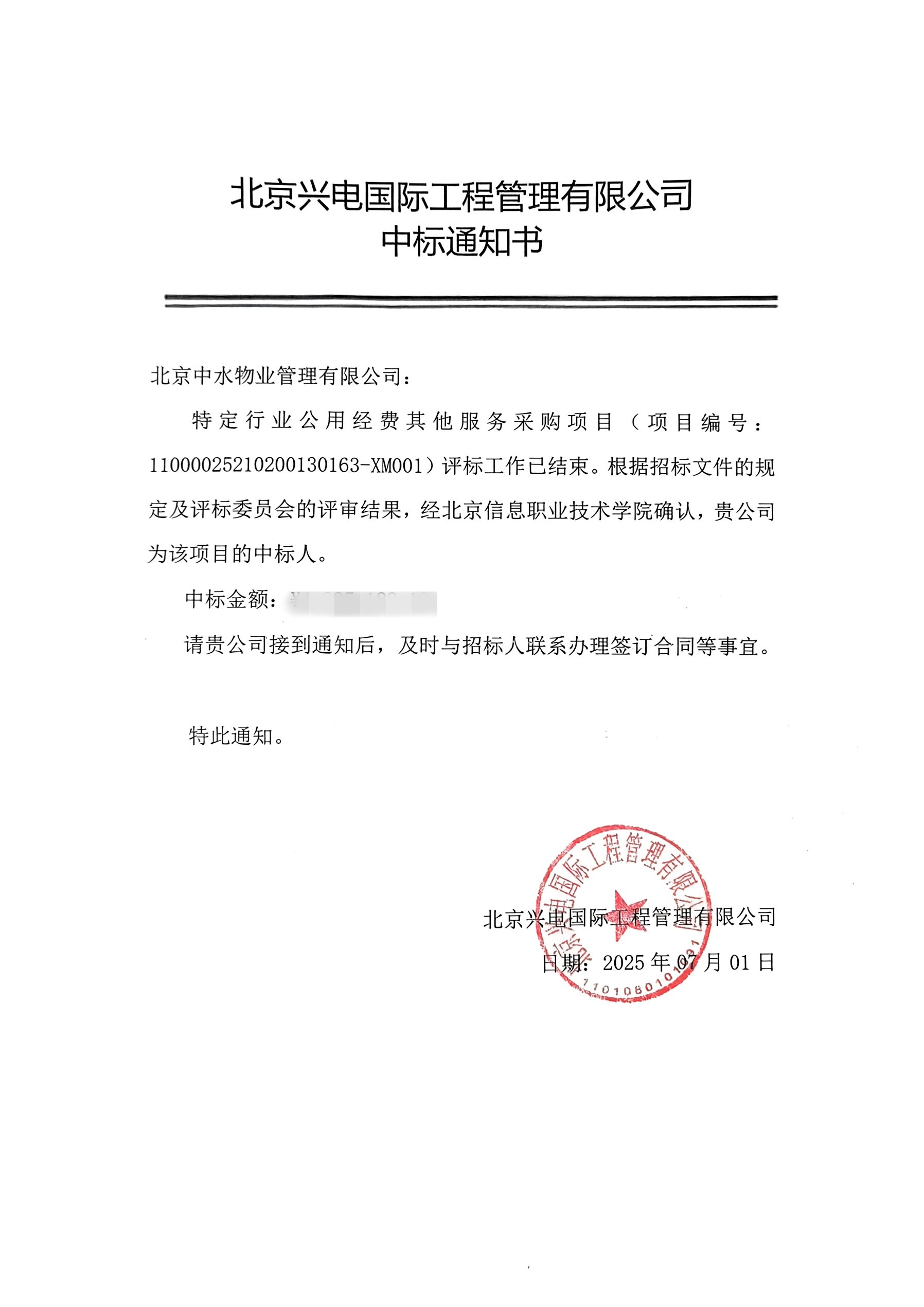中水物业成功中标特定行业公用经费其他服务采购项目