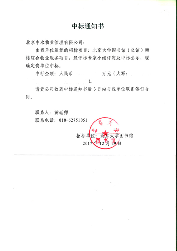 北京大学图书馆(总馆)西楼综合物业服务项目成功中标