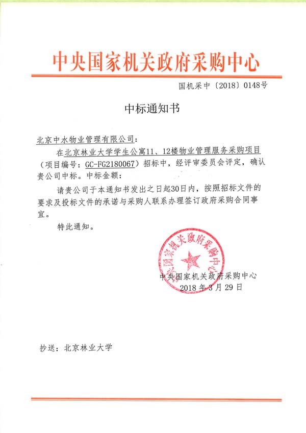 北京林业大学学生公寓11、12楼物业管理服务项目成功中标
