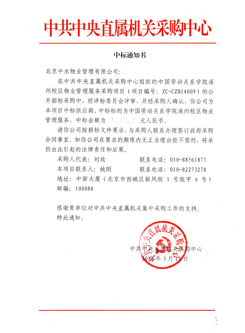 喜讯: 2014年3月19日中国劳动关系学院涿州校区物业管理服务采购项目成功中标