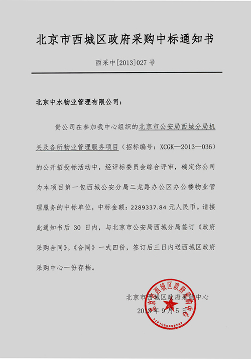 北京市公安局西城分局机关及各所物业管理服务项目成功中标