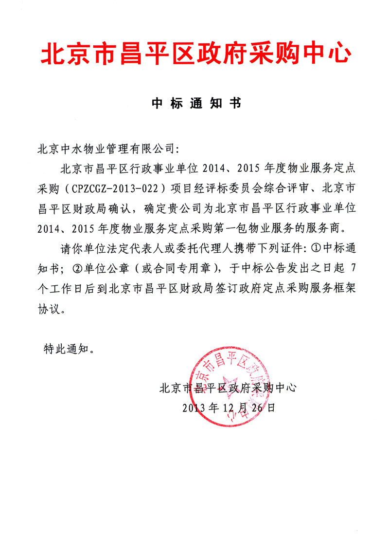 成功入围北京市昌平区行政事业单位2014、2015年度物业服务定点采购供应商