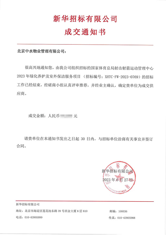 中水物业成功中标国家体育总局射击射箭运动管理中心2023年绿化养护及室外保洁服务项目